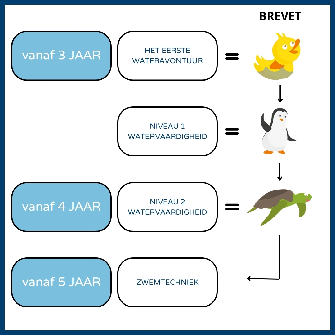 1 reeks Watervaardigheid bestaat uit maximum 10 lesjes (1 les/week van 30minuten gedurende opeenvolgende weken). Het Eerste Wateravontuur is een 5-lessenreeks.